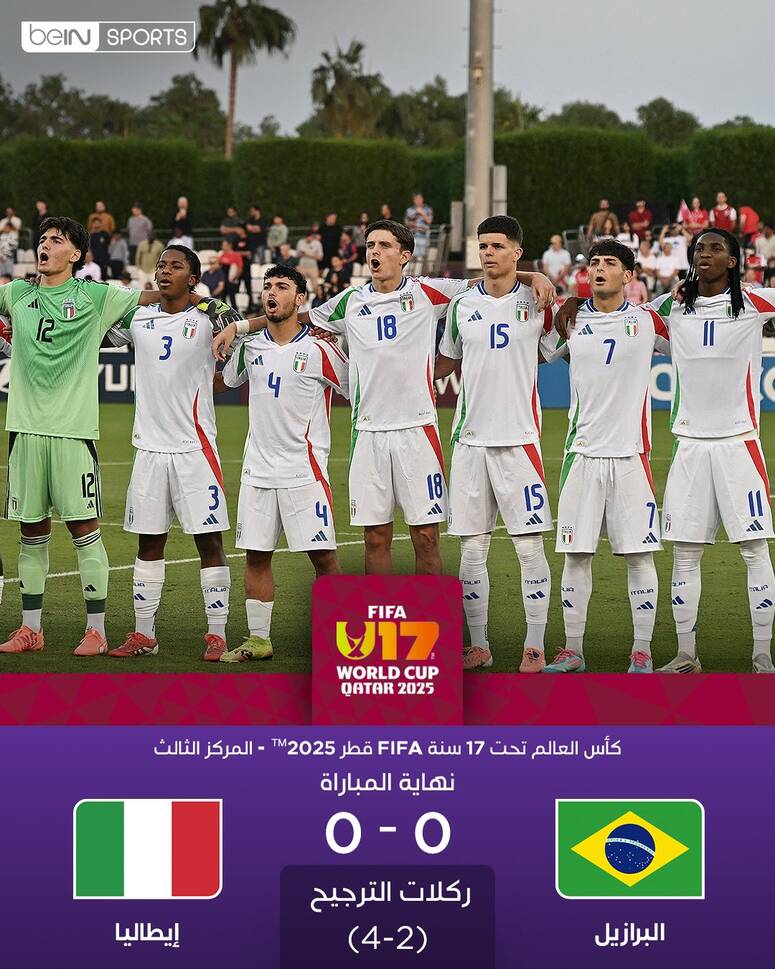 احرز المنتخب الإيطالي المركز الثالث في كأس العالم لكرة القدم تحت 17 عاما قطر 2025، وذلك عقب فوزه على نظيره البرازيلي بركلات الترجيح 4 - 2 في المواجهة التي جمعت بينهما اليوم، على ملعب منصور مفتاح بمجمع المسابقات في أسباير زون.