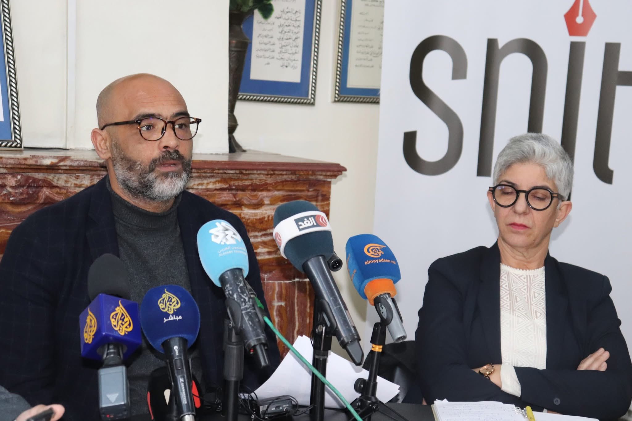 أما رئيس النقابة الوطنية للصحفيين، زياد دبار، فقد ندّد بسجن عدد من الصحفيين وملاحقتهم قضائياً استناداً إلى المرسوم 54، إضافة إلى التراجع عن الحق في النفاذ إلى المعلومة، وحرمان الصحفيين من بطاقة الصحفي المحترف، والتأخر في إرساء هيئة تعديلية للقطاع. كما أشار إلى تدهور الوضعية الاقتصادية والاجتماعية للصحفيين، لافتاً إلى أن قانون المالية الأخير لم يستجب لمطلب الانتداب في القطاع العمومي، ما عمّق هشاشة التشغيل في القطاع الخاص.