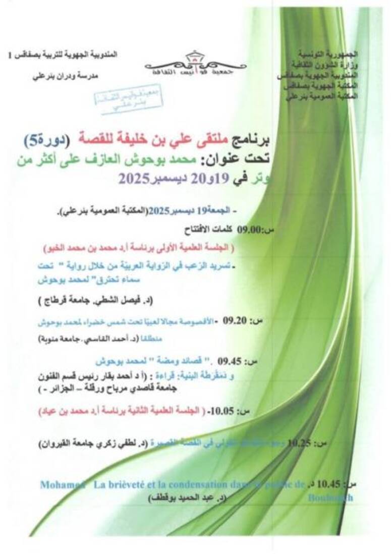الدورة 5 لملتقى علي بن خليفة للقصة يومي 19 و20 ديسمبر 2025 بالمكتبة العمومية ببئر علي بن خليفة ومدرسة ودران