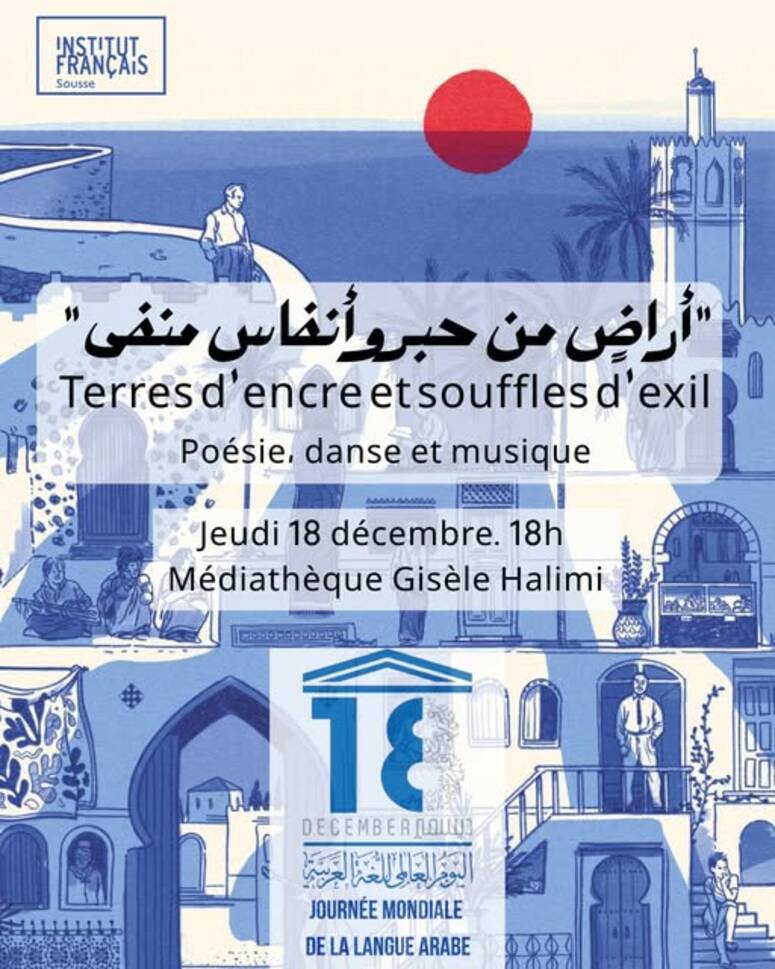 ستستضيف المكتبة الوسائطية "جيزيل حليمي"، بالمعهد الفرنسي بسوسة، يوم 18 ديسمبر 2025، بمناسبة اليوم العالمي للغة العربية عرض "أرض من حبر وأنفاس منفى" (Terres d’encre et souffles d’exil).