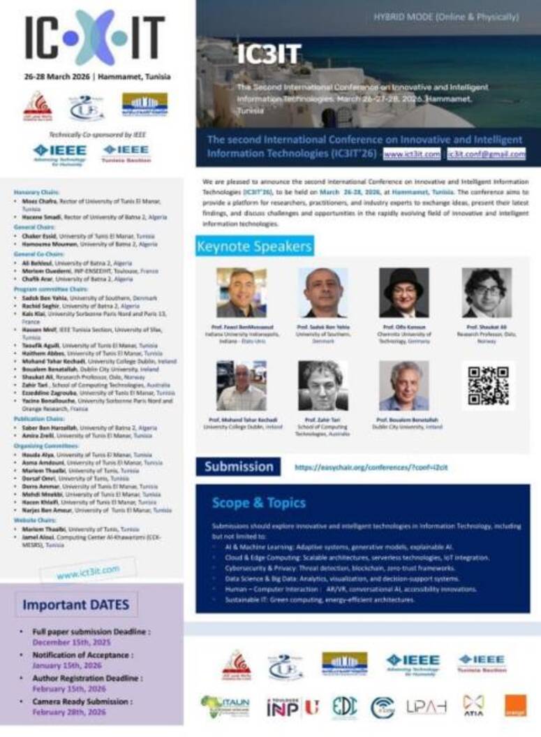 تنعقد الدورة الثانية للمؤتمر الدولي حول التقنيات المبتكرة والذكية للمعلومات ( (IC3IT’26 في الفترة من 26 إلى 28 مارس 2026 بالحمامات، ولاية نابل، معتمدة على المشاركة الحضورية وعن