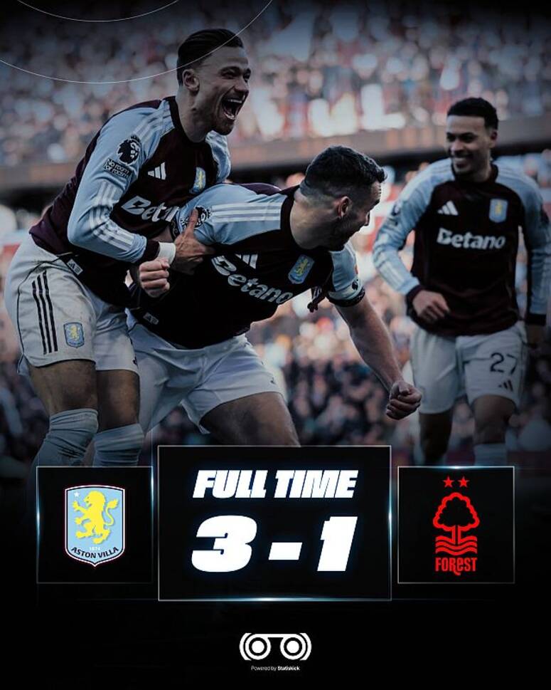 سجل جون مكجين هدفين في الشوط الثاني، وسجل اولي واتكينز هدفه الرابع في ثلاث مباريات، ليقودا أستون فيلا للفوز 3-1 على ضيفه نوتنغهام فورست اليوم السبت، ويتقدم إلى المركز الثاني في البطولة الإنقليزية الممتازة لكرة القدم.