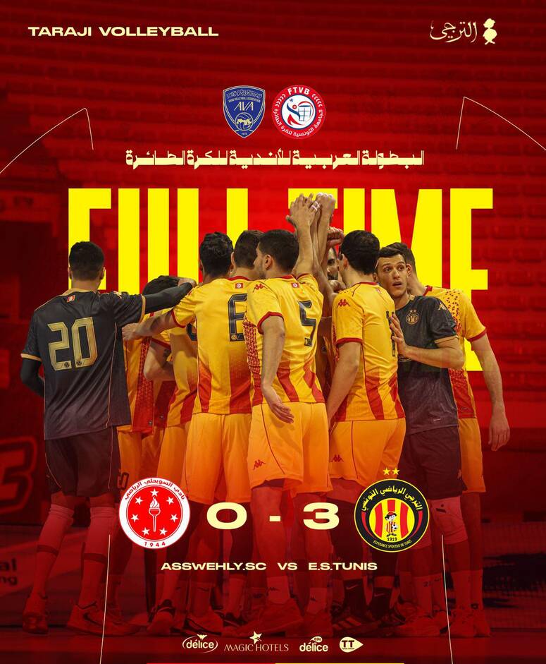 فاز الترجي الرياضي التونسي على السويحلي الليبي بثلاثة أشواط نظيفة، اليوم الاثنين، في إطار الجولة الخامسة من منافسات المجموعة الأولى ضمن الدور الأول من البطولة العربية للأندية للكرة الطائرة المقامة حاليًا بقصر الرياضة بالمنزه.