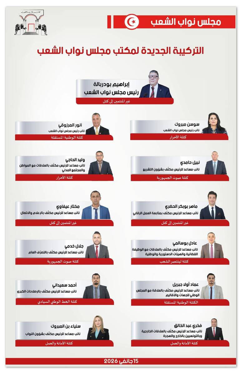 ووفق بلاغ صادر عن البرلمان، جاءت التركيبة الجديدة لمكتب مجلس نواب الشعب على النحو التالي: