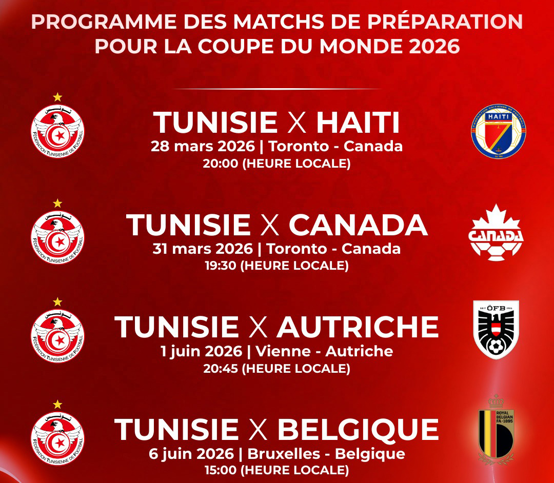 أعلنت الجامعة التونسية لكرة القدم، اليوم الثلاثاء، عن برنامج المباريات الودية التي سيخوضها المنتخب الوطني التونسي في إطار الاستعداد لنهائيات كأس العالم 2026، التي ستُقام بكل من كندا والولايات المتحدة الأمريكية والمكسيك.