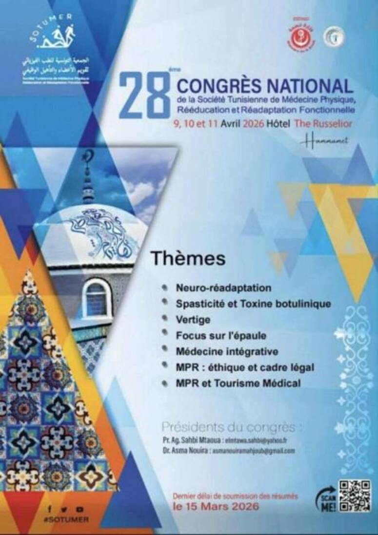 أعلنت الجمعية التونسية للطب الفيزيائي والتأهيل الوظيفي بالتعاون مع قسم الطب الفيزيائي وإعادة التأهيل بالقيروان، عن تنظيم المؤتمر الوطني 28 للجمعية، وذلك من 9 إلى 11 أفريل 2026 بمدينة الحمّامات.