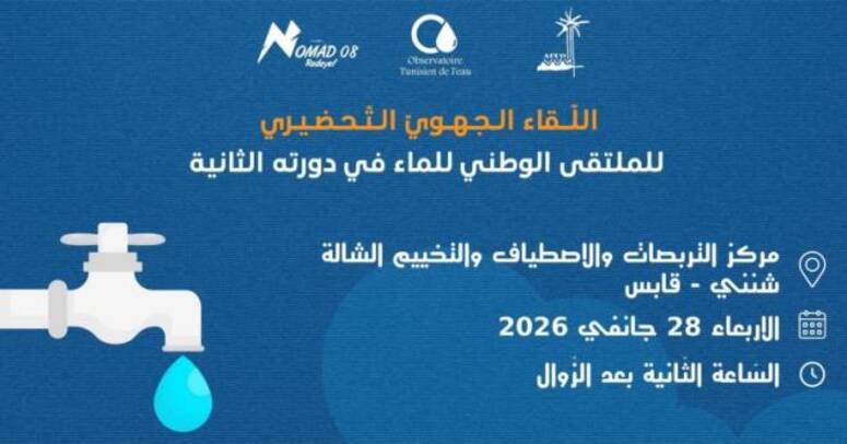 اللقاء الجهوي التحضيري للملتقى الوطني للماء في دورته الثانية يوم 28 جانفي 2026 بمركز التربصات والاصطياف والتخييم شنني بولاية قابس