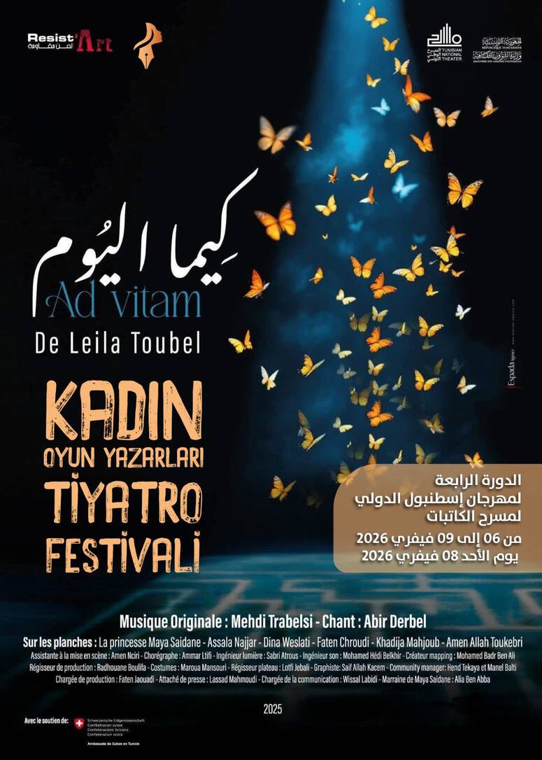 تشارك المسرحية التونسية "كيما اليوم" لليلى طوبال ضمن فعاليات الدورة الرابعة لمهرجان إسطنبول الدولي لمسرح الكاتبات الذي ينتظم بالعاصمة التركية من 6 إلى 9 فيفري 2026، وذلك بحسب ما أعلنته مؤسسة المسرح الوطني التونسي.