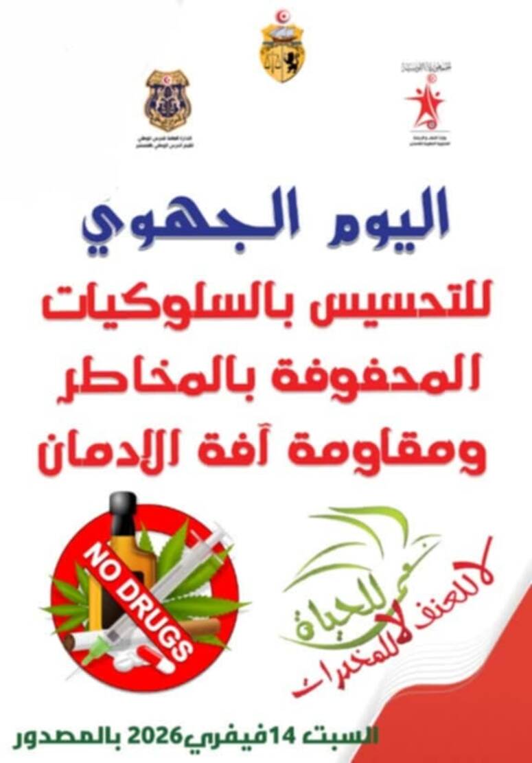 تنظم، المندوبية الجهوية للشباب والرياضة بالمنستير، بالشراكة مع اقليم الحرس الوطني بالمنستير وعدد من المؤسسات الشبابية وكافة الهياكل المتدخلة "اليوم الجهوي للتحسيس بالسلوكيات المحفوفة بالمخاطر ومقاومة آفة الادمان" بمدينة المصدور، وذلك يوم السبت 14 فيفري 2026.