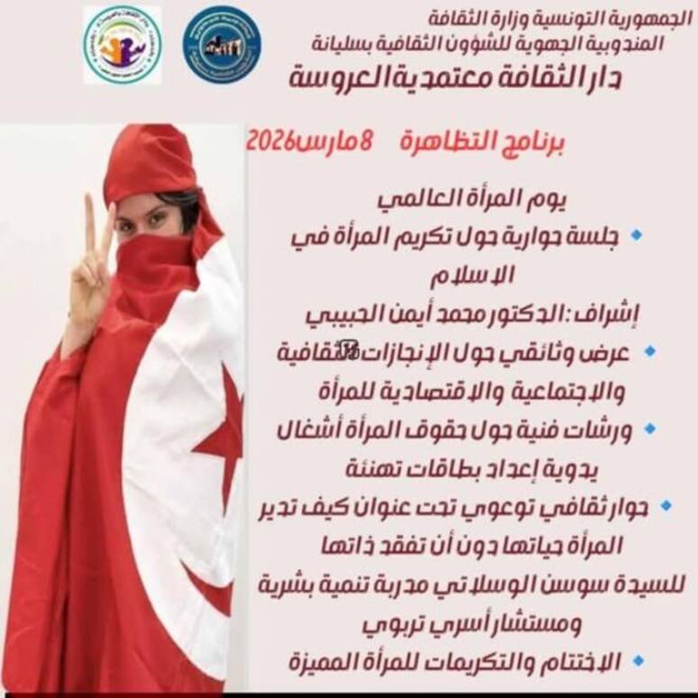 تنظم دار الثقافة بمدينة العروسة من ولاية سليانة، تظاهرة احتفالية من 6 إلى 8 مارس 2026، وذالك بمناسبة الاحتفال باليوم العالمي للمراة.