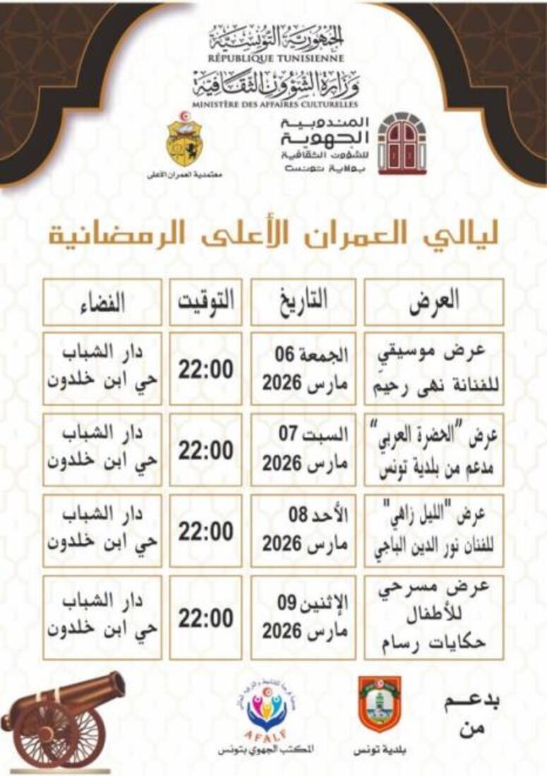 تنظم، معتمدية العمران الاعلى، باشراف المندوبية الجهوية للشؤون الثقافية بولاية تونس، الدورة الثانية لتظاهرة "ليالي العمران الاعلى الرمضانية"، وذلك من 06 الى 09 مارس 2026.