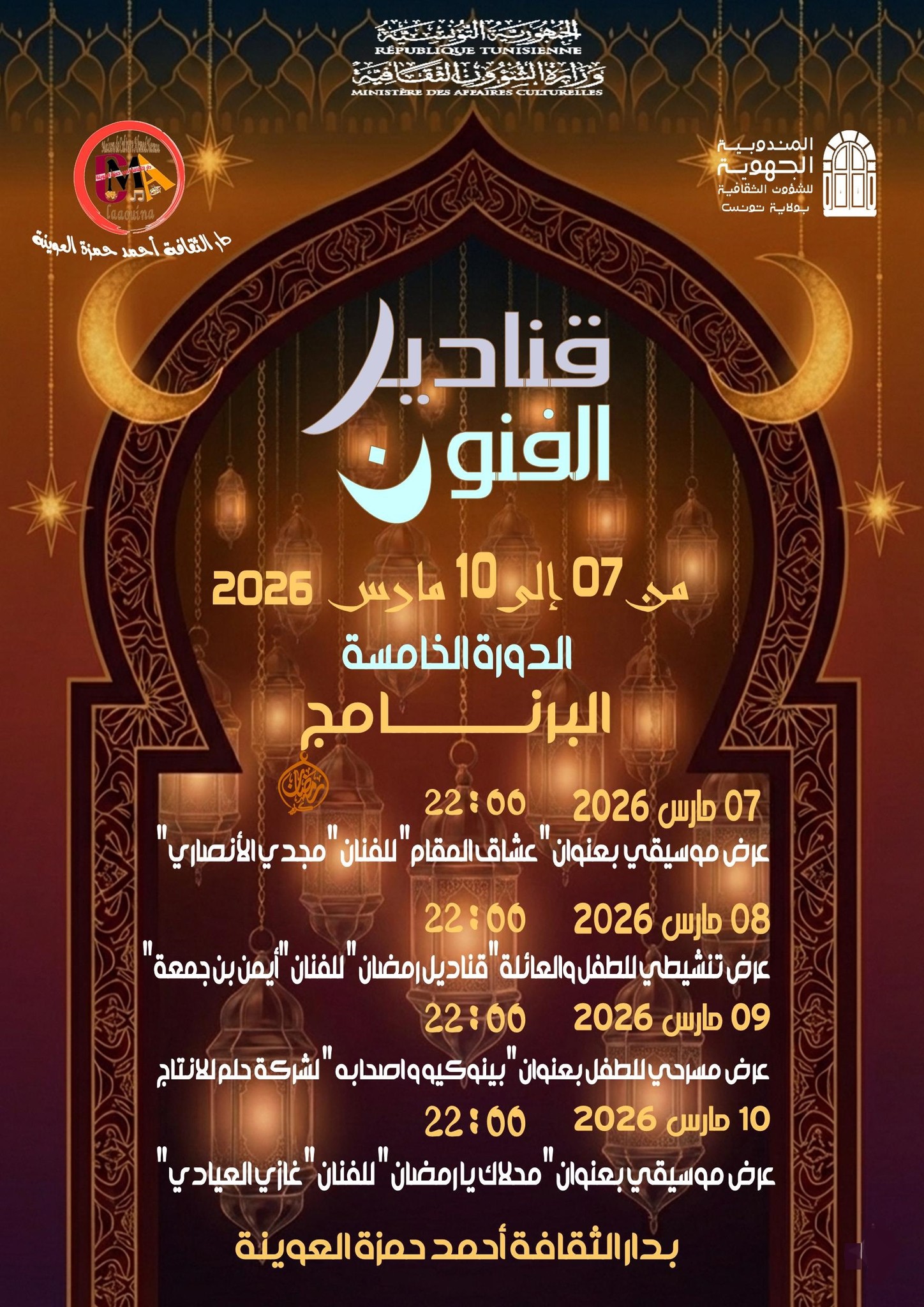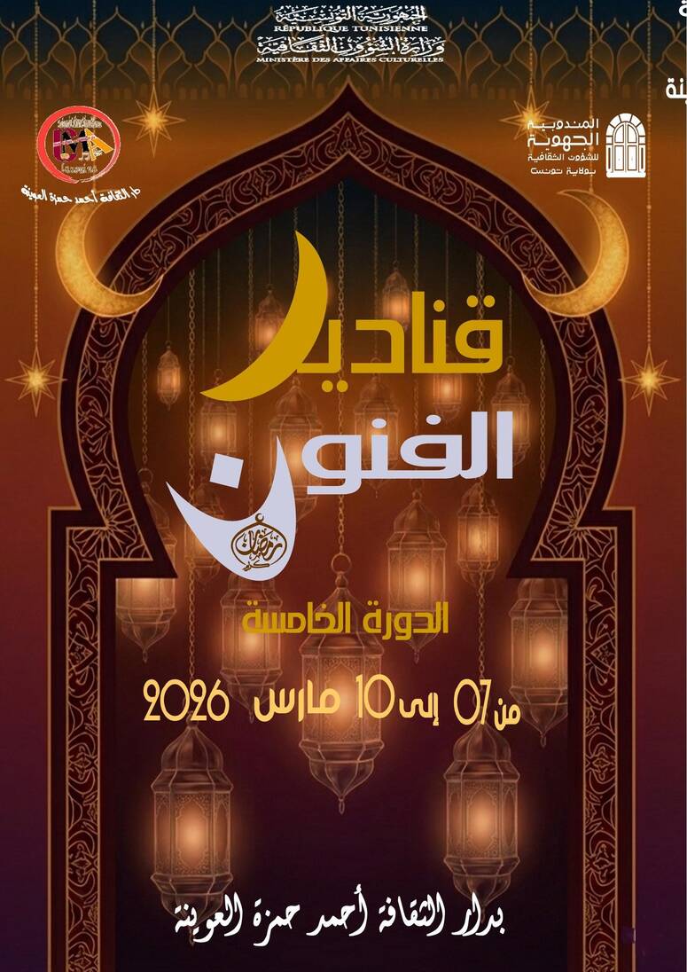 تنظم دار الثقافة أحمد حمزة العوينة تحت اشراف وزارة الشؤون الثقافية والمندوبية الجهوية للشؤون الثقافية بولاية تونس، الدورة الخامسة لتظاهرة قناديل الفنون وذلك من 7 الى 14 مارس الجاري