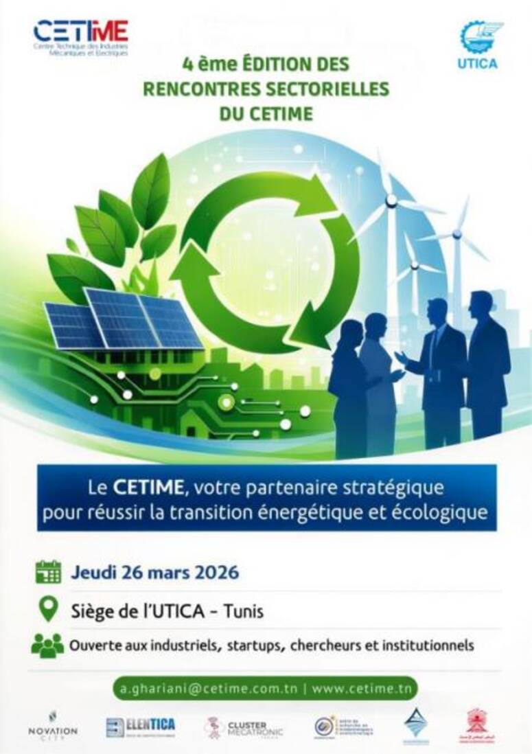 ستنعقد النسخة الرابعة من اللقاءات القطاعية المخصّصة للصناعات الكهربائية والإلكترونية والميكاترونية يوم 26 مارس 2026 بمقر الإتحاد التونسي للصناعة والتجارة والصناعات التقليدية وذلك ببادرة من المركز التقني للصناعات الميكانيكية والكهربائية