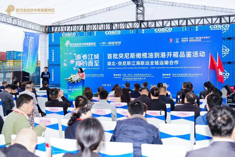 突尼斯驻北京大使馆借突尼斯橄榄油运抵之机,与中国武汉阳逻港务公司合作,在湖北港口码头现场举办了一场经济推广活动。