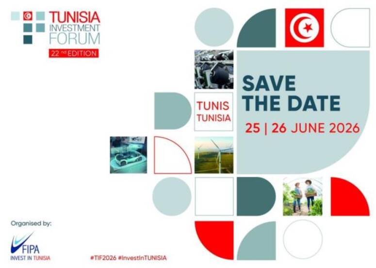 تحت إشراف وزارة الاقتصاد والتخطيط تنظم وكالة النهوض بالاستثمار الخارجي الدورة 22 لمنتدى تونس للاستثمار يومي 25 و 26 جوان 2026.