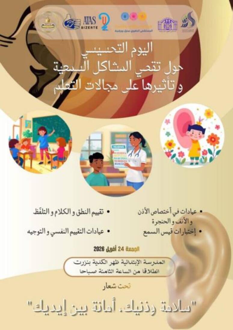 يوم تحسيسي حول تقصي المشاكل السمعية وتأثيرها على مجالات التعلم يوم 24 افريل 2026 بالمدرسة الابتدائية ظهر الكدية بولاية بنزرت