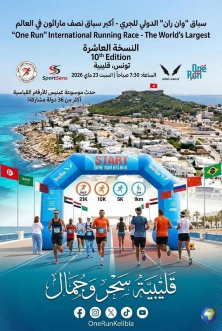 تحتضن مدينة قليبية من ولاية نابل، حدثا رياضيا دوليا سباق " وان ران" الدولي للجري، الذي تنظمه الجامعة التونسية لالعاب القوى وشركة "سبورسان" (SportSens)، يوم السبت 23 ماي المقبل