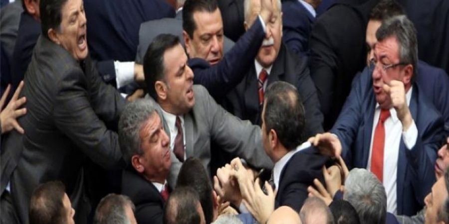 وتبادل نواب من حزب العدالة والتنمية الحاكم وحزب الشعب الجمهوري وهو حزب المعارضة الرئيسي اللكمات ودفعوا بعضهم بعضا بعد أن تجمعوا حول المنصة.