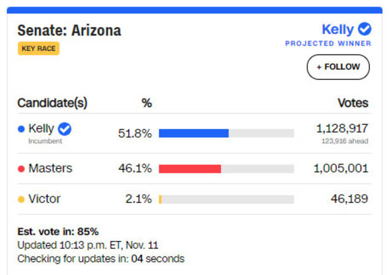 وذكرت شبكتا "سي إن إن" و"سي بي إس" التلفزيونيّتان أنّ رائد الفضاء السابق مارك كيلي تغلّب على خصمه الجمهوري بليك ماسترز في هذه الولاية الجنوبيّة الغربيّة.