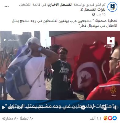 تداولت حسابات على مواقع التواصل الاجتماعي مقطع فيديو ادّعت أنه يعود إلى شاب جزائري في قطر يرفع علم فلسطين أمام مشجّع إسرائيلي، خلال تجمعات كأس العالم قطر 2022