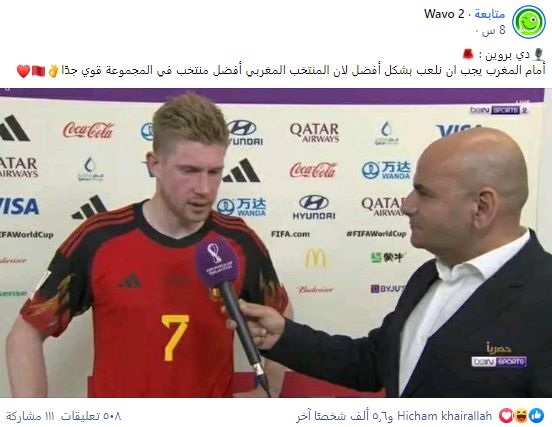 ولم يصرح لاعب كرة القدم البلجيكي كيفين دي بروين، عقب نهاية مباراة منتخب بلجيكا أمام كندا، بأن المغرب أقوى منتخب في مجموعتهم بمونديال قطر