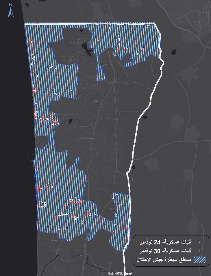 انخفض عدد الآليات في محور بيت حانون من 78 آلية يوم 24 نوفمبر إلى 37 آلية يوم 30 نوفمبر.
