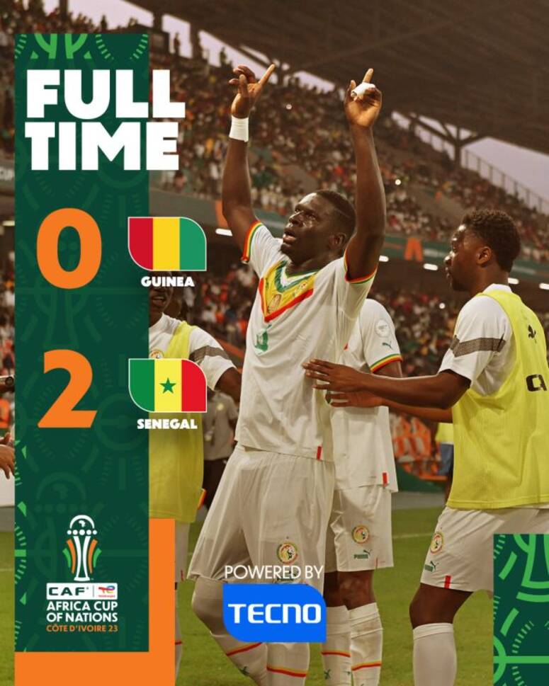 فاز منتخب السنغال على نظيره غينيا، بهدفين دون مقابل، في المباراة التي أقيمت بينهما على ملعب شارلز كونان باني، ضمن مباريات الجولة الثالثة والأخيرة بالمجموعة الثالثة من دور المجموعات في كأس أمم إفريقيا 2023 بكوت ديفوار.