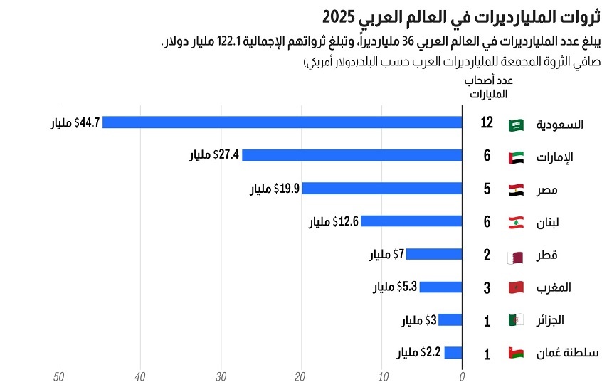 كشفت مجلة فوربس الشرق الأوسط في تقريرها السنوي لعام 2025 عن قائمة الدول العربية وفق إجمالي ثروات المليارديرات، حيث بلغ مجموع ثروات 36 مليارديرًا عربيًا نحو 122.1 مليار دولار أمريكي، موزعين على عدة دول في المنطقة.