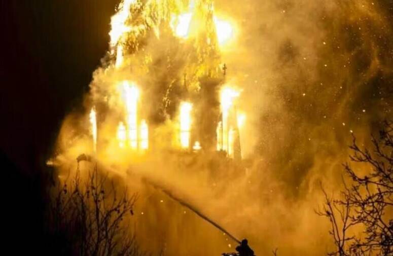 وبدأت النيران بعد منتصف الليل مباشرة، مما أدى إلى انهيار برج الكنيسة التي يعود تاريخ بنائها إلى عام 1872.