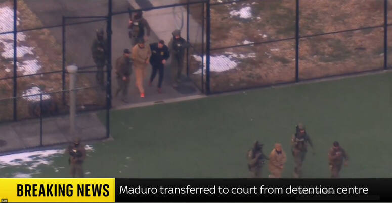 نقل الرئيس الفنزويلي نيكولاس مادورو مكبلا بالأصفاد أثناء نقله إلى المحكمة الفيدرالية في مانهاتن من مركز الاحتجاز الذي كان محتجزا فيه.