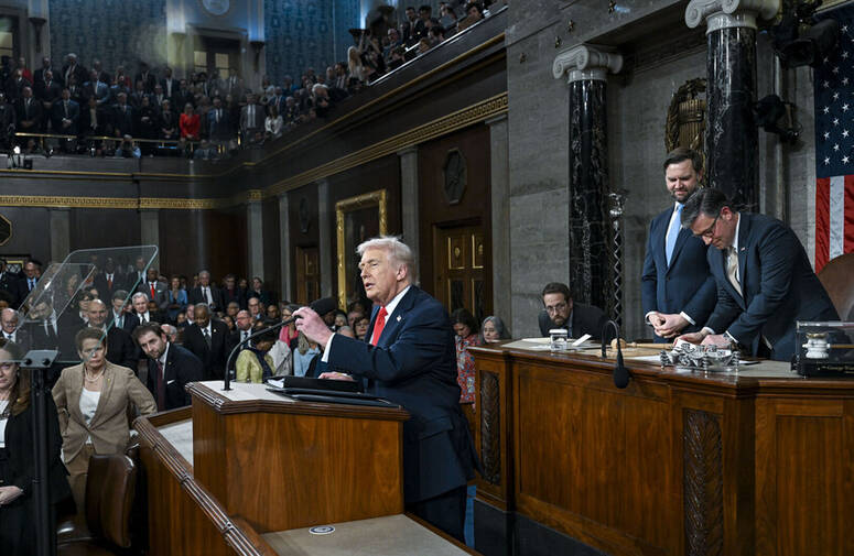 وأكد ترامب خلال خطاب حالة الاتحاد أمام الكونغرس، التزام سياسة أمريكية تاريخية بمنع طهران من امتلاك سلاح نووي، محذرا من صواريخها الباليستية القادرة على الوصول إلى أمريكا وأوروبا، وقال إن الإيرانيين طوروا صواريخ قادرة على تهديد أوروبا وقواعدنا في الخارج، ووصف النظام الإيراني بـ"راعي الإرهاب الأول" الذي قتل ملايين عبر وكلائه منذ 47 عاما.