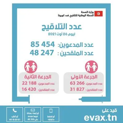 أفادت وزارة الصحة اليوم الجمعة أنه تم بتاريخ يوم الخميس 26 أوت الجاري تطعيم 48247 شخصا ضد كورونا من جملة 85454 شخصا تمت دعوتهم للتلقيح