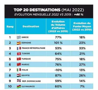 حافظت تونس على تصنيفها في المرتبة الرابعة ضمن الوجهات السياحية المفضلة لدى السائح الفرنسي قبل تركيا والمغرب ومصر، حسب البارومتر الشهري، الذي يعده الموقع الفرنسي المختص في السياحة والرحلات والترفيه "الايكو توريستيك" ماي 2022.