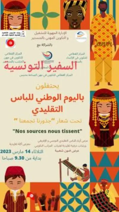 تحت شعار "جذورنا تجمعنا"، تنظم الإدارة الجهوية للتشغيل والتكوين المهني بالمنستير، بدعم من المندوبية الجهوية للشؤون الثقافية، تظاهرة الاحتفال باليوم الوطني للباس التقليدي يوم 14 مارس الجاري بالمركب التكويني المهني بالسواني، وذلك بمشاركة أكثر من ألف من المتكوّنين التونسيين والدوليين، وفق المكلفة بتنشيط الحياة الجامعية بوحدة المبيت والمطعم للتكوين المهني ندى بن فاطمة.