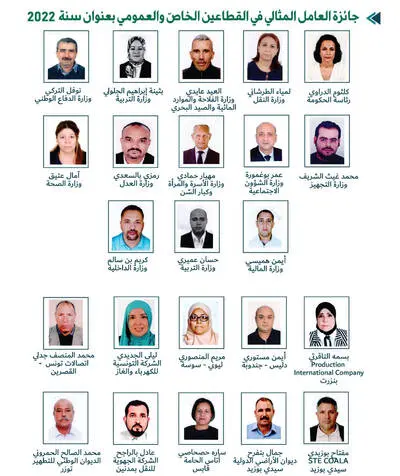 وآلت جائزة العامل المثالي في القطاعين الخاص والعمومي والتي تسند لمن تميّزوا أثناء القيام بواجباتهم المهنية بالمثالية وروح البذل والحماس والابتكار وحبّ المبادرة والحرص على الزيادة في الإنتاج وتحسين الإنتاجية والجودة إلى كل من: