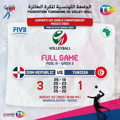 انقادت فتيات المنتخب الوطني التونسي للكرة الطائرة للوسطيات الى هزيمة جديدة امام منتخب الدومينيكان مساء اليوم الاربعاء بنتيجة 3-1 تفاصيلها (19-25 و 23-25 و 25-23 و22-25)