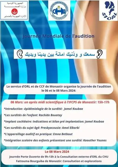 وينظم ذات القسم يوم 8 مارس الجاري يوما مفتوحا حول مشاكل السمع بالعيادات الخارجية لأمراض الأذنين والأنف والحنجرة بالمستشفي الجامعي فطومة بورقيبة.