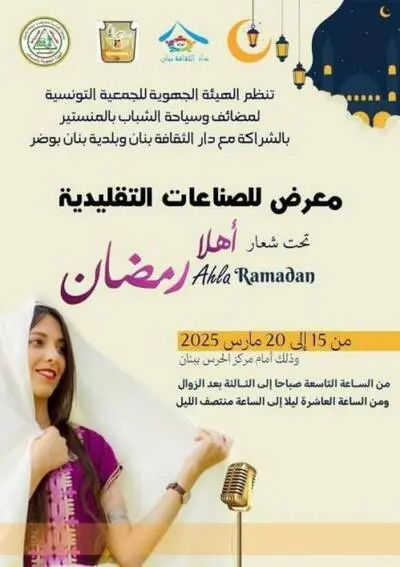 تحت شعار "أهلا رمضان"، تنظم الهيئة الجهوية للجمعية التونسية لمضائف وسياحة الشباب بالمنستير الدورة الثانية لمعرض الصناعات التقليدية ببنان من معتمدية قصيبة المديوني من 15 إلى 20 مارس الجاري بمسرح الهواء الطلق ببنان، بمشاركة 30 عارضا وعارضة (17 عارضا السنة الفارطة)، وذلك بدعم من المندوبية الجهوية للشؤون الثقافية بالمنستير وبالشراكة مع دار الثقافة بنان وبلدية بنان بوضر والمجتمع المدني.