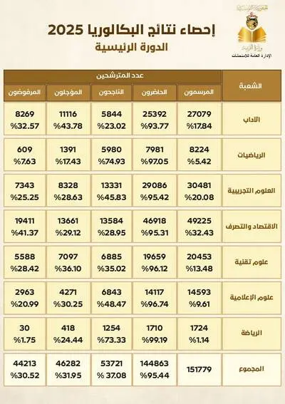 * نسبة النجاح العامة: 37.08% (53,721 ناجحًا من 144,863 مترشحًا)* نسبة المؤجلين إلى دورة المراقبة: 31.95% (46,282 تلميذًا)