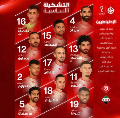 في ما يلي التشكيلة الأساسية للمنتخب الوطني التونسي لكرة القدم في مباراته الافتتاحية لحساب الجولة الأولى من منافسات المجموعة الأولى لكأس العرب قطر 2025، والتي تنطلق اليوم على الساعة الثانية ظهرا (14:00) بملعب أحمد بن علي: