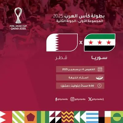 وكان المنتخب السوري، الذي يقوده المدرب الإسباني خوسية لانا، قد بلغ نهائيات بطولة كأس العرب قطر 2025 بعدما تجاوز منتخب جنوب السودان بهدفين دون رد في التصفيات التمهيدية، ليسجل ظهوره الثامن.