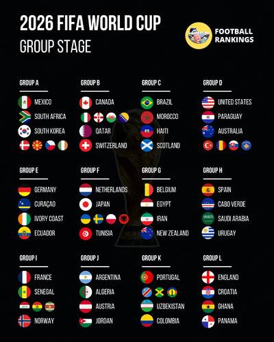 أسفرت عملية سحب قرعة نهائيات كأس العالم 2026 التي احتضنها، مساء الجمعة، مركز كينيدي للفنون بواشنطن، عن توزيع المنتخبات الـ48 المشاركة على 12 مجموعة، وذلك في نسخة تاريخية تُقام لأول مرة في ثلاث دول: كندا والولايات المتحدة الأمريكية والمكسيك، خلال الفترة الممتدة من 11 جوان إلى 19 جويلية 2026.