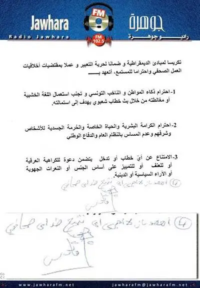 وأمضى الباجي قايد السبسي على ميثاق كان أعده الاعلامي زهير الجيس متعهدا كتابيا بعدم التضييق على الحريات ومتابعة الصحافيين قضائيا.