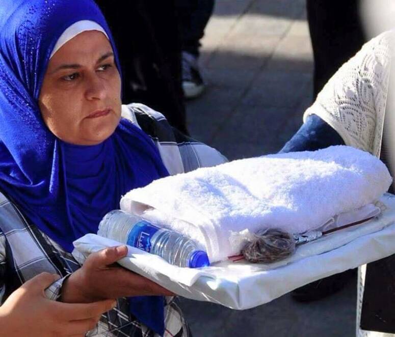 وظهرت والدة نذير في الصورة في مشهد مؤثّر جدّا وقد جفّت دموعها حزنا على ابنها وهي تحمل كفنه بعد نبأ مقتله.