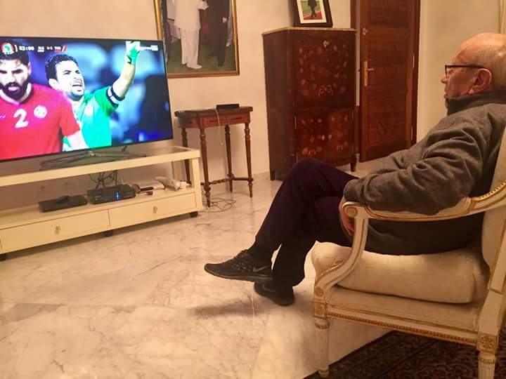 باب نات - علق الإعلامي سمير الوافي في تدوينة في صفحته الرسمية على الفايسبوك على صورة رئيس الجمهورية الباجي قائد السبسي وهو يشاهد مقابلة المنتخب الوطني التونسي مع نظيره الجزائري.
