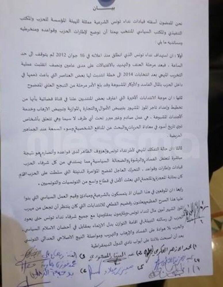 , أن موجة الانتدابات الأخيرة صلب حركة نداء تونس هي من اعداد " تاجر الموز المشهور بتبييض الأموال والارهاب", معبّرين عن رفضهم هذه التوجهات داخل الحزب.وأكدوا الموقعون على البيان أنهم سيواصلون نضالهم حتى يستعيد الحزب عافيته.