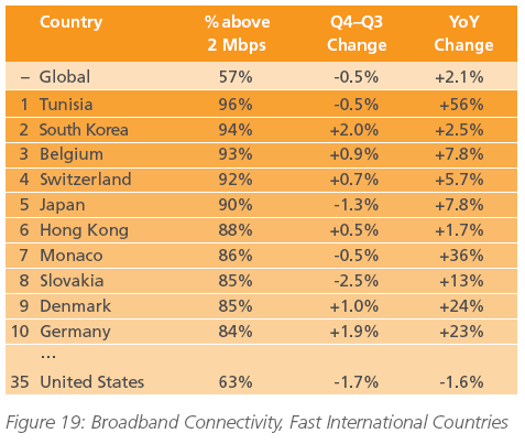 Akamai a également constaté que les niveaux les plus élevés de connectivité « très haut débit » (>5 Mbps) étaient mesurés en Corée du Sud.