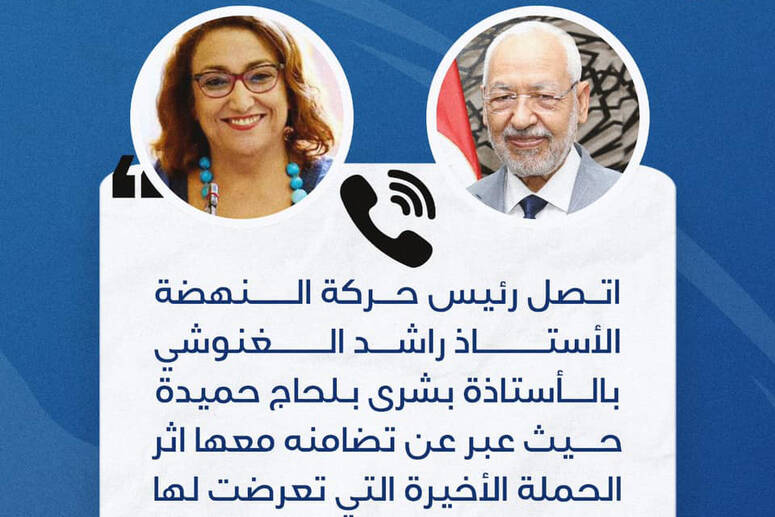 أعلنت الجمعة 2 أكتوبر، الصفحة الرسمية لحركة النهضة، أن زعيم الحركة راشد الغنوشي اتصل بالأستاذة بشرى بلحاج حميدة حيث عبر عن تضامنه معها اثر الحملة الأخيرة التي تعرضت لها.