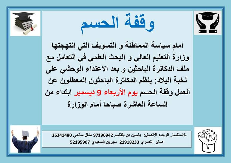 أعلن ممثلي الدكاترة الباحثين التونسيين المعطلين عن العمل الّذين و المعتصمين منذ ستة أشهر بوزارة التعليم العالي والبحث العلمي، أنهم ينظمون وقفة احتجاجية يوم الاربعاء 9ديسمبر 2020 على الساعة العاشرة صباحا أمام وزارة التعليم العالي و البحث العلمي بشارع حفوز .