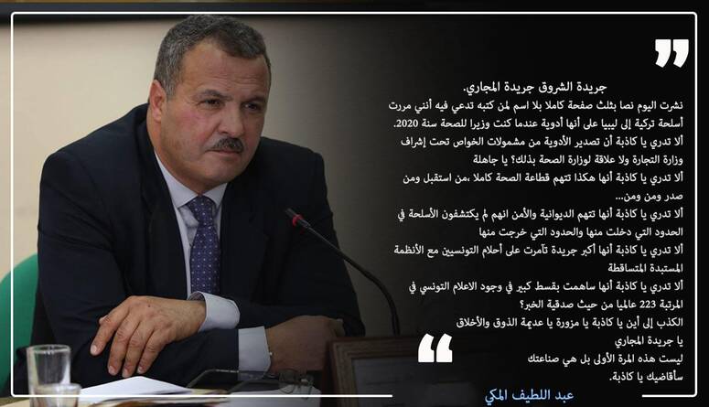 وقال المكي "الشروق نشرت اليوم نصا بثلث صفحة كاملا بلا اسم لمن كتبه تدعي فيه أنني مررت أسلحة تركية إلى ليبيا على أنها أدوية عندما كنت وزيرا للصحة سنة 2020.